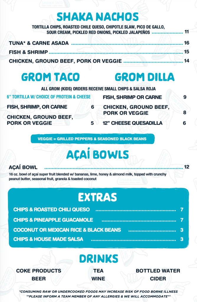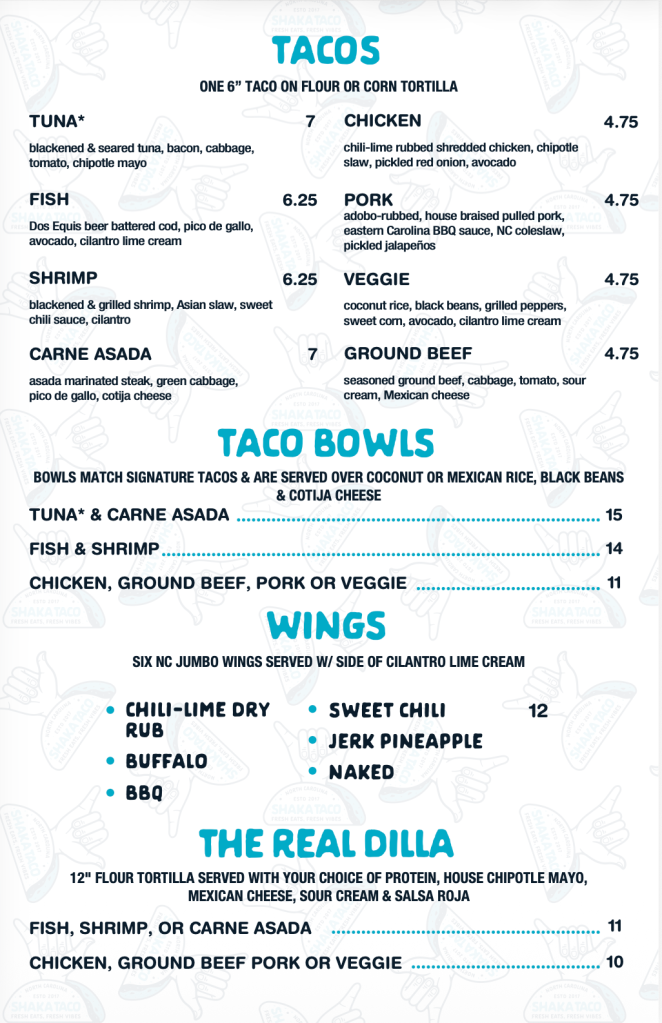 Shaka Taco’s Mainland Location Shaka Taco is now open everyday from 11am to 8pm. Stop by or call 910.274.9733 to place your order! Lunch Special Monday – Friday 11AM to 4PM Now Serving Breakfast! Thursday – Sunday 8AM to 11AM Check Out our Menu Visit Shaka Taco’s Website for More Info